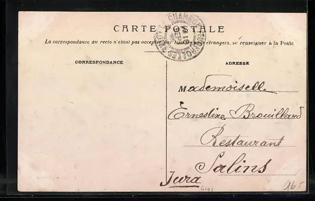 Personenbezogene Daten auf der Rückseite der Karte wurden durch blauen Textmarker unkenntlich gemacht. Die blauen Stellen sind auf die Vorderseite durchgeweicht und wirken sich negativ auf das Postkartenfoto aus