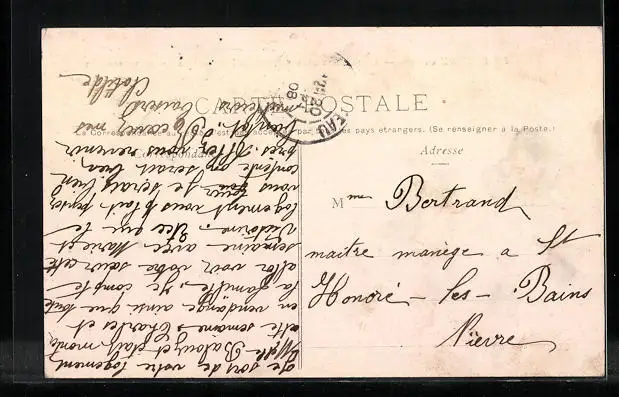Personenbezogene Daten auf der Rückseite der Karte wurden durch blauen Textmarker unkenntlich gemacht. Die blauen Stellen sind auf die Vorderseite durchgeweicht und wirken sich negativ auf das Postkartenfoto aus