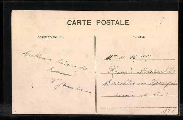 Personenbezogene Daten auf der Rückseite der Karte wurden durch blauen Textmarker unkenntlich gemacht. Die blauen Stellen sind auf die Vorderseite durchgeweicht und wirken sich negativ auf das Postkartenfoto aus