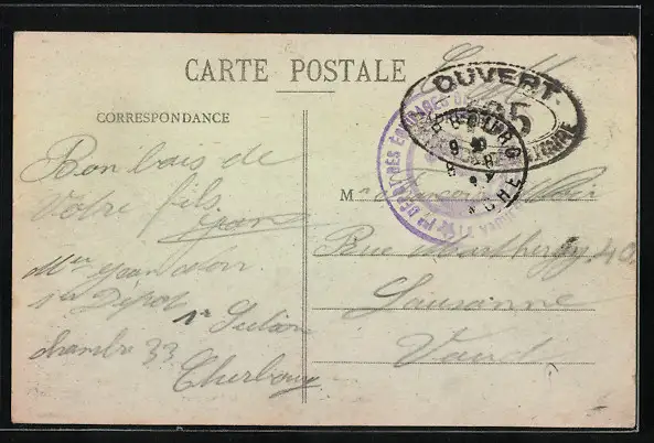 Personenbezogene Daten auf der Rückseite der Karte wurden durch blauen Textmarker unkenntlich gemacht. Die blauen Stellen sind auf die Vorderseite durchgeweicht und wirken sich negativ auf das Postkartenfoto aus