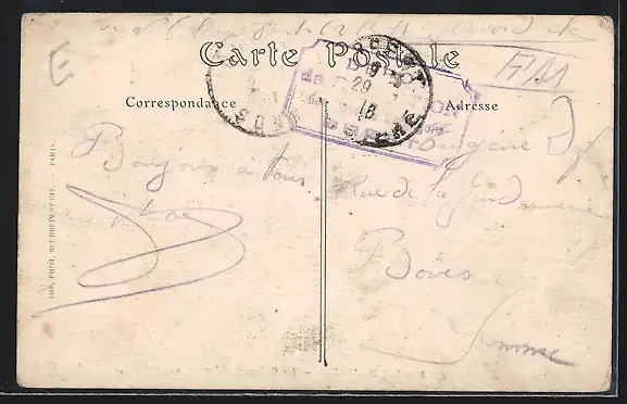 Personenbezogene Daten auf der Rückseite der Karte wurden durch blauen Textmarker unkenntlich gemacht. Die blauen Stellen sind auf die Vorderseite durchgeweicht und wirken sich negativ auf das Postkartenfoto aus