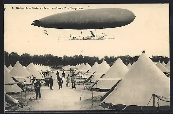 AK Le Dirigeable militaire au-dessus d`un Campement, Zeppelin