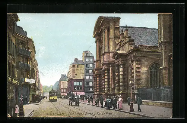 AK Le Havre, Eglise Notre Dame, Rue de Paris, Strassenbahn
