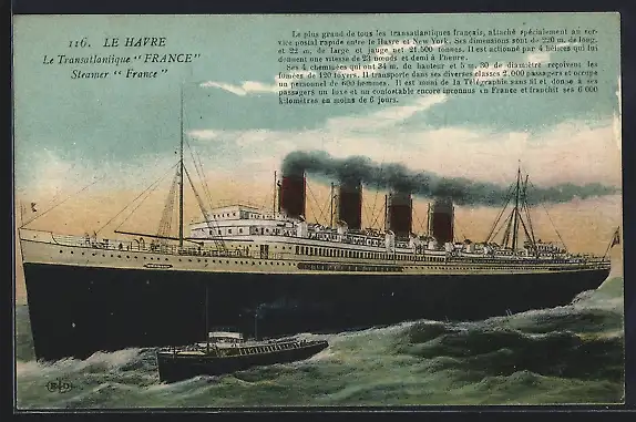 AK Le Havre, Le Transatlantique France, Passagierschiff in Fahrt