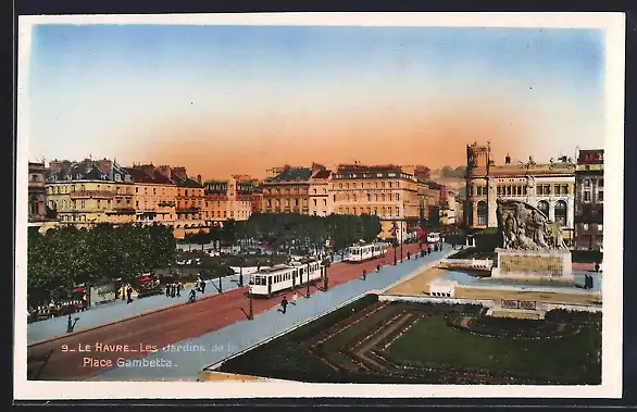 AK Le Havre, Les Jardins de la Place Gambette, Strassenbahn