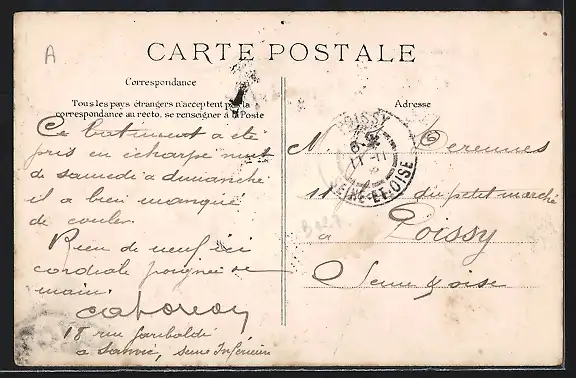 Personenbezogene Daten auf der Rückseite der Karte wurden durch blauen Textmarker unkenntlich gemacht. Die blauen Stellen sind auf die Vorderseite durchgeweicht und wirken sich negativ auf das Postkartenfoto aus