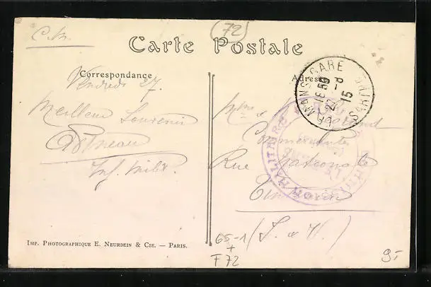 Personenbezogene Daten auf der Rückseite der Karte wurden durch blauen Textmarker unkenntlich gemacht. Die blauen Stellen sind auf die Vorderseite durchgeweicht und wirken sich negativ auf das Postkartenfoto aus