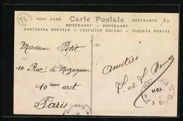 Personenbezogene Daten auf der Rückseite der Karte wurden durch blauen Textmarker unkenntlich gemacht. Die blauen Stellen sind auf die Vorderseite durchgeweicht und wirken sich negativ auf das Postkartenfoto aus