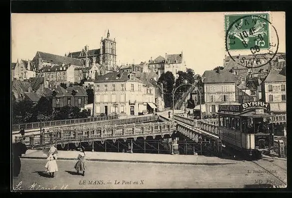 AK Le Mans, Le Pont eu X, eine Strassenbahn auf der Brücke
