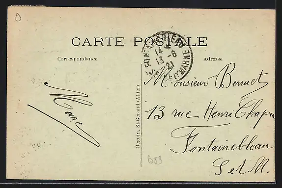 Personenbezogene Daten auf der Rückseite der Karte wurden durch blauen Textmarker unkenntlich gemacht. Die blauen Stellen sind auf die Vorderseite durchgeweicht und wirken sich negativ auf das Postkartenfoto aus