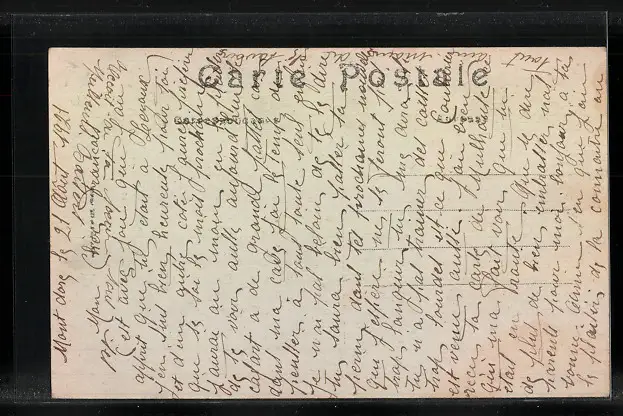 Personenbezogene Daten auf der Rückseite der Karte wurden durch blauen Textmarker unkenntlich gemacht. Die blauen Stellen sind auf die Vorderseite durchgeweicht und wirken sich negativ auf das Postkartenfoto aus