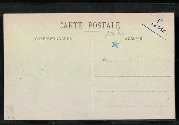 Personenbezogene Daten auf der Rückseite der Karte wurden durch blauen Textmarker unkenntlich gemacht. Die blauen Stellen sind auf die Vorderseite durchgeweicht und wirken sich negativ auf das Postkartenfoto aus
