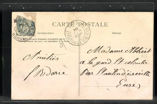 gelaufen 1904, Briefmarke tw. entfernt, rückseitig Oberflächenschaden, Stempelspur, sonst guter Zustand