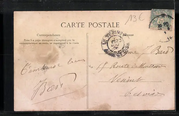 Personenbezogene Daten auf der Rückseite der Karte wurden durch blauen Textmarker unkenntlich gemacht. Die blauen Stellen sind auf die Vorderseite durchgeweicht und wirken sich negativ auf das Postkartenfoto aus