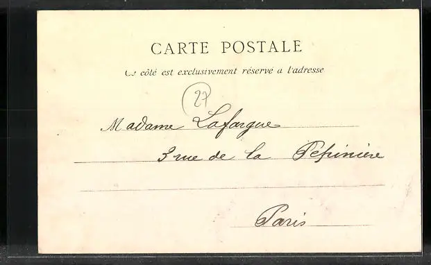 Personenbezogene Daten auf der Rückseite der Karte wurden durch blauen Textmarker unkenntlich gemacht. Die blauen Stellen sind auf die Vorderseite durchgeweicht und wirken sich negativ auf das Postkartenfoto aus