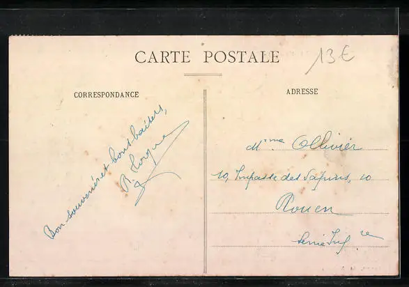 Personenbezogene Daten auf der Rückseite der Karte wurden durch blauen Textmarker unkenntlich gemacht. Die blauen Stellen sind auf die Vorderseite durchgeweicht und wirken sich negativ auf das Postkartenfoto aus