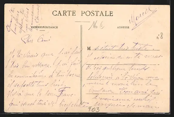 Personenbezogene Daten auf der Rückseite der Karte wurden durch blauen Textmarker unkenntlich gemacht. Die blauen Stellen sind auf die Vorderseite durchgeweicht und wirken sich negativ auf das Postkartenfoto aus