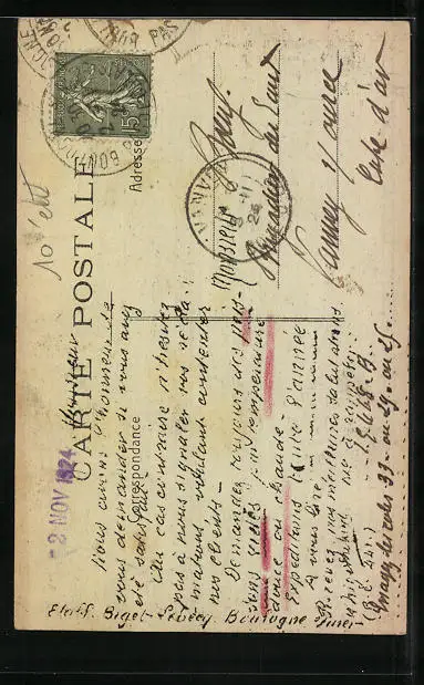 Personenbezogene Daten auf der Rückseite der Karte wurden durch blauen Textmarker unkenntlich gemacht. Die blauen Stellen sind auf die Vorderseite durchgeweicht und wirken sich negativ auf das Postkartenfoto aus