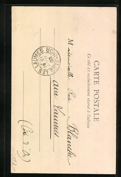 Personenbezogene Daten auf der Rückseite der Karte wurden durch blauen Textmarker unkenntlich gemacht. Die blauen Stellen sind auf die Vorderseite durchgeweicht und wirken sich negativ auf das Postkartenfoto aus