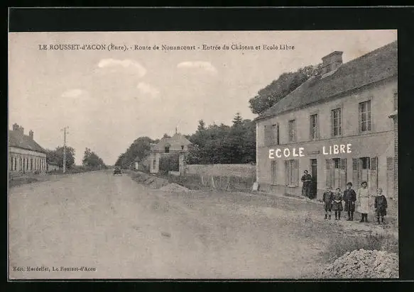 AK Le Rousset-d'Acon, Route de Nonancourt, Entrée du Chateau et Ecole Libre