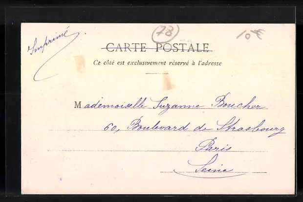 Personenbezogene Daten auf der Rückseite der Karte wurden durch blauen Textmarker unkenntlich gemacht. Die blauen Stellen sind auf die Vorderseite durchgeweicht und wirken sich negativ auf das Postkartenfoto aus