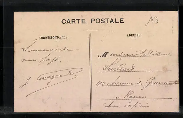 Personenbezogene Daten auf der Rückseite der Karte wurden durch blauen Textmarker unkenntlich gemacht. Die blauen Stellen sind auf die Vorderseite durchgeweicht und wirken sich negativ auf das Postkartenfoto aus