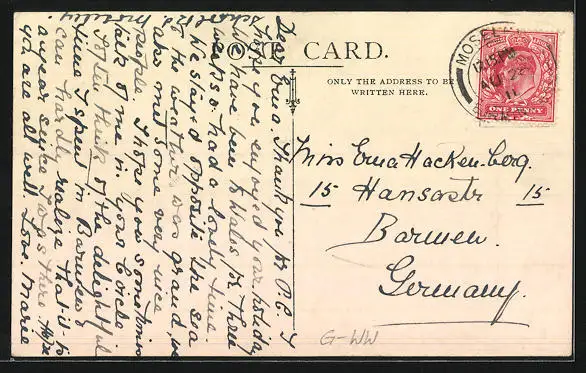 Personenbezogene Daten auf der Rückseite der Karte wurden durch blauen Textmarker unkenntlich gemacht. Die blauen Stellen sind auf die Vorderseite durchgeweicht und wirken sich negativ auf das Postkartenfoto aus