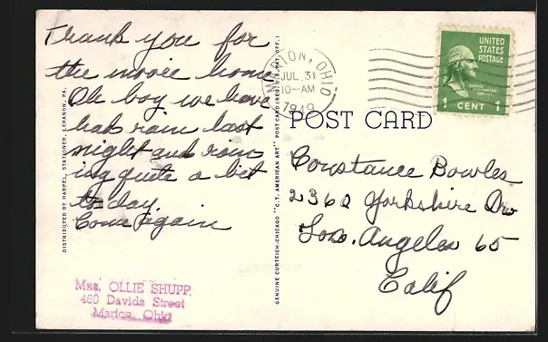 Personenbezogene Daten auf der Rückseite der Karte wurden durch blauen Textmarker unkenntlich gemacht. Die blauen Stellen sind auf die Vorderseite durchgeweicht und wirken sich negativ auf das Postkartenfoto aus
