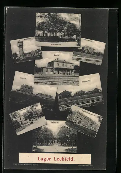 AK Lechfeld, Bahnhof mit Passagieren, Lazareth, Wasserturm
