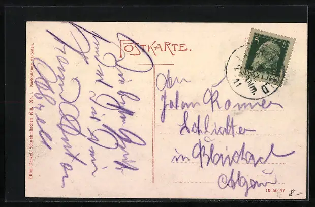 Personenbezogene Daten auf der Rückseite der Karte wurden durch blauen Textmarker unkenntlich gemacht. Die blauen Stellen sind auf die Vorderseite durchgeweicht und wirken sich negativ auf das Postkartenfoto aus