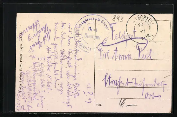 Personenbezogene Daten auf der Rückseite der Karte wurden durch blauen Textmarker unkenntlich gemacht. Die blauen Stellen sind auf die Vorderseite durchgeweicht und wirken sich negativ auf das Postkartenfoto aus