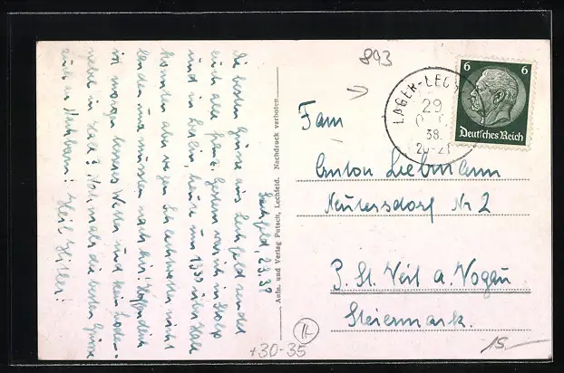 Personenbezogene Daten auf der Rückseite der Karte wurden durch blauen Textmarker unkenntlich gemacht. Die blauen Stellen sind auf die Vorderseite durchgeweicht und wirken sich negativ auf das Postkartenfoto aus