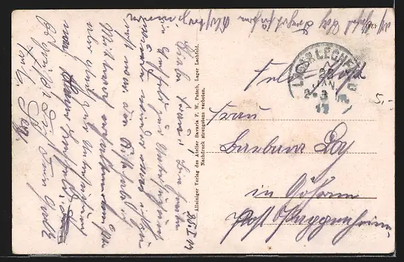 Personenbezogene Daten auf der Rückseite der Karte wurden durch blauen Textmarker unkenntlich gemacht. Die blauen Stellen sind auf die Vorderseite durchgeweicht und wirken sich negativ auf das Postkartenfoto aus