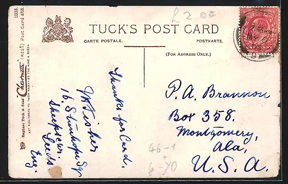 alte Ansichtskarte, gelaufen 1908, rückseitig Oberflächenschaden, Kantenschaden li. mittig und oben mittig, Eckschaden li. unten, Einriss re. unten