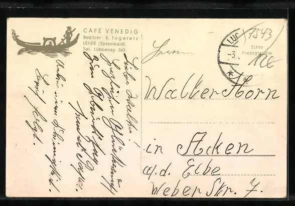 Personenbezogene Daten auf der Rückseite der Karte wurden durch blauen Textmarker unkenntlich gemacht. Die blauen Stellen sind auf die Vorderseite durchgeweicht und wirken sich negativ auf das Postkartenfoto aus