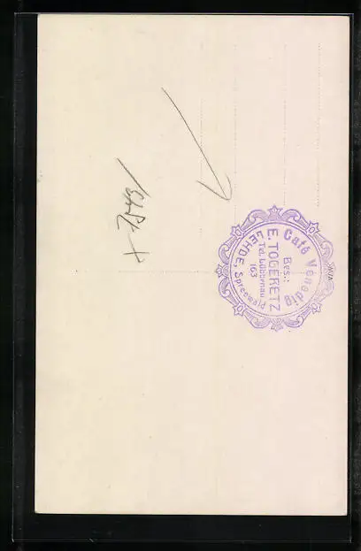 Personenbezogene Daten auf der Rückseite der Karte wurden durch blauen Textmarker unkenntlich gemacht. Die blauen Stellen sind auf die Vorderseite durchgeweicht und wirken sich negativ auf das Postkartenfoto aus