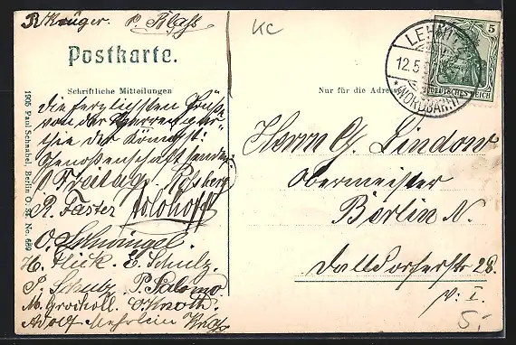 Personenbezogene Daten auf der Rückseite der Karte wurden durch blauen Textmarker unkenntlich gemacht. Die blauen Stellen sind auf die Vorderseite durchgeweicht und wirken sich negativ auf das Postkartenfoto aus