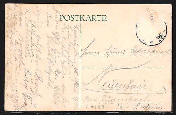 Personenbezogene Daten auf der Rückseite der Karte wurden durch blauen Textmarker unkenntlich gemacht. Die blauen Stellen sind auf die Vorderseite durchgeweicht und wirken sich negativ auf das Postkartenfoto aus
