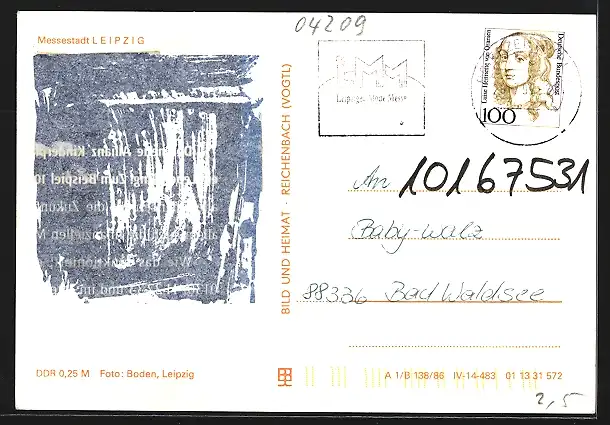 Personenbezogene Daten auf der Rückseite der Karte wurden durch blauen Textmarker unkenntlich gemacht. Die blauen Stellen sind auf die Vorderseite durchgeweicht und wirken sich negativ auf das Postkartenfoto aus