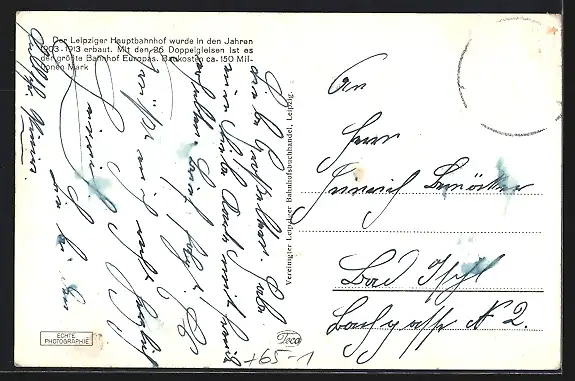 Personenbezogene Daten auf der Rückseite der Karte wurden durch blauen Textmarker unkenntlich gemacht. Die blauen Stellen sind auf die Vorderseite durchgeweicht und wirken sich negativ auf das Postkartenfoto aus