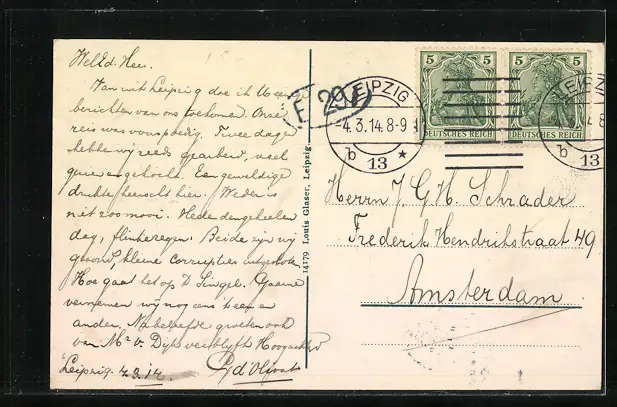 Personenbezogene Daten auf der Rückseite der Karte wurden durch blauen Textmarker unkenntlich gemacht. Die blauen Stellen sind auf die Vorderseite durchgeweicht und wirken sich negativ auf das Postkartenfoto aus
