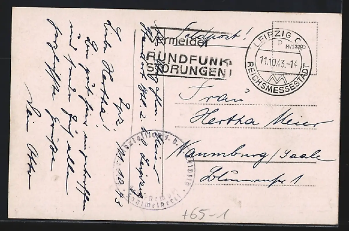 Personenbezogene Daten auf der Rückseite der Karte wurden durch blauen Textmarker unkenntlich gemacht. Die blauen Stellen sind auf die Vorderseite durchgeweicht und wirken sich negativ auf das Postkartenfoto aus