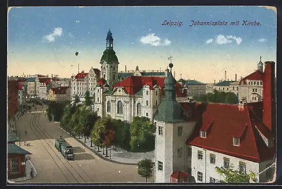 AK Leipzig, Johannisplatz mit Kirche und Strassenbahn