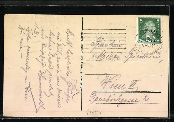 Personenbezogene Daten auf der Rückseite der Karte wurden durch blauen Textmarker unkenntlich gemacht. Die blauen Stellen sind auf die Vorderseite durchgeweicht und wirken sich negativ auf das Postkartenfoto aus