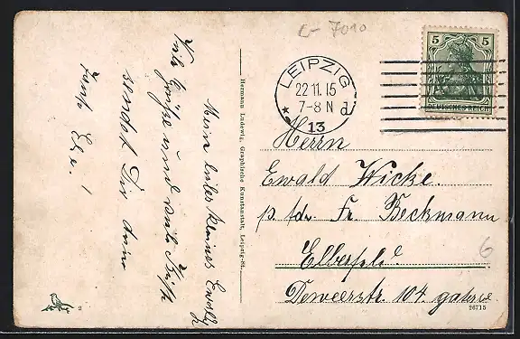 gelaufen 1915, Eckknicke li. unten u. re. oben, guter Zustand