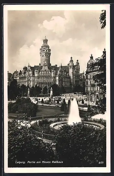 AK Leipzig, Partie am Neuen Rathaus, mit Springbrunnen