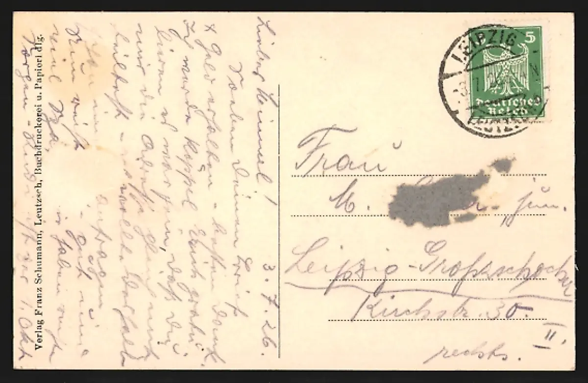 gelaufen 1926, rückseitig Klebe- und Papierreste, rückseitig Oberflächenschaden, guter Zustand