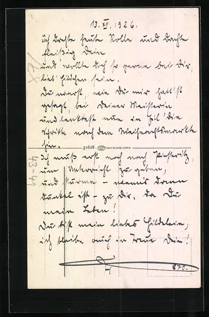 Personenbezogene Daten auf der Rückseite der Karte wurden durch blauen Textmarker unkenntlich gemacht. Die blauen Stellen sind auf die Vorderseite durchgeweicht und wirken sich negativ auf das Postkartenfoto aus