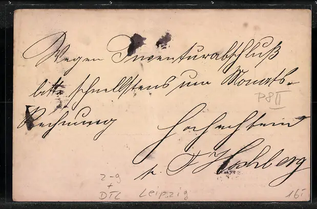 Personenbezogene Daten auf der Rückseite der Karte wurden durch blauen Textmarker unkenntlich gemacht. Die blauen Stellen sind auf die Vorderseite durchgeweicht und wirken sich negativ auf das Postkartenfoto aus