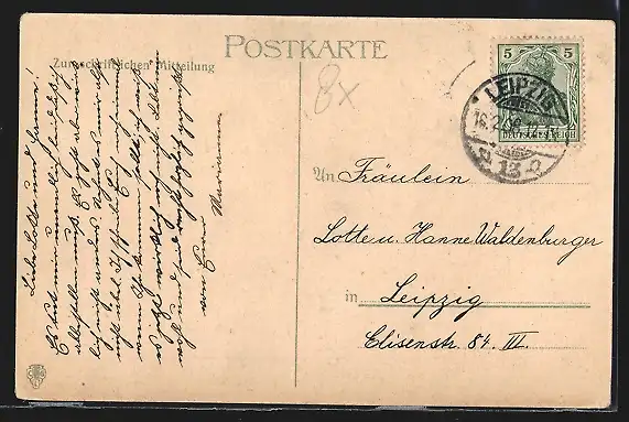 alte Ansichtskarte, gelaufen 1908, Eckknick re. unten, Ecken bestoßen, guter Zustand